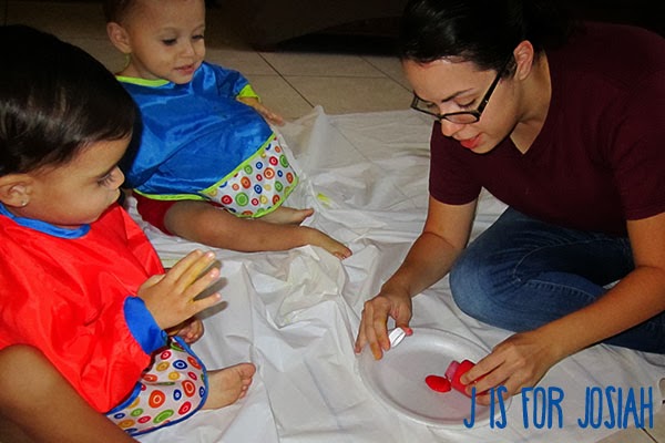 I started out by pouring some yellow paint into the paper plate and then rubbing Lily's hand in it. We made 3 hand prints on the paper to act as feathers for the Turkey, then it was Josiah's turn.